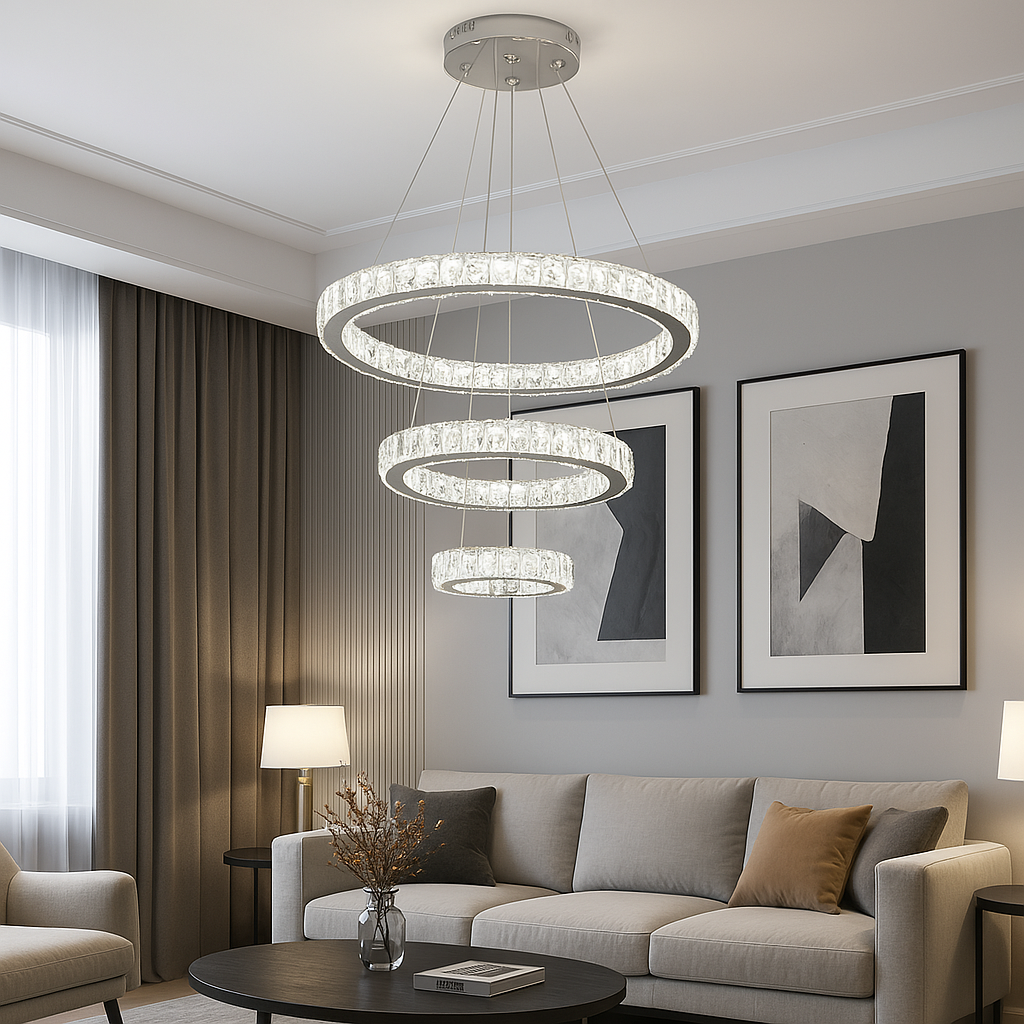 Кришталева світлодіодна люстра-підвіс кільця 7201W/650+400+200
